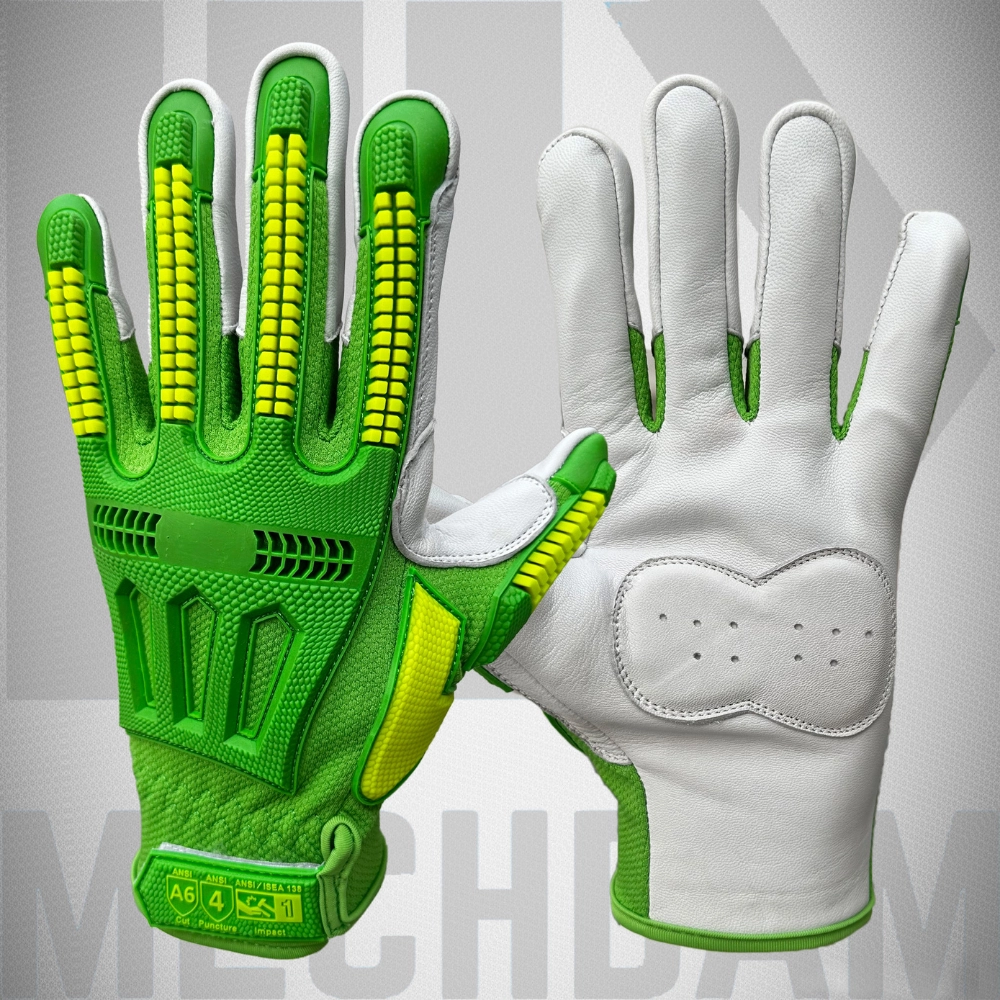 Short Description – Key Specifications • Impact Protection Cut Level A6 gloves designed for industrial safety applications • ANSI Cut Level A6 protection for handling sharp and abrasive materials • TPR impact protection on knuckles, fingers, and metacarpal area • Durable leather palm for strong grip and abrasion resistance • Ergonomic design for flexibility and all-day comfort • High-visibility color for improved hand safety in low-light environments • Suitable for oil & gas, construction, mining, and heavy manufacturing use • Available for OEM, private labeling, and bulk manufacturing by Mechdam Enterprises